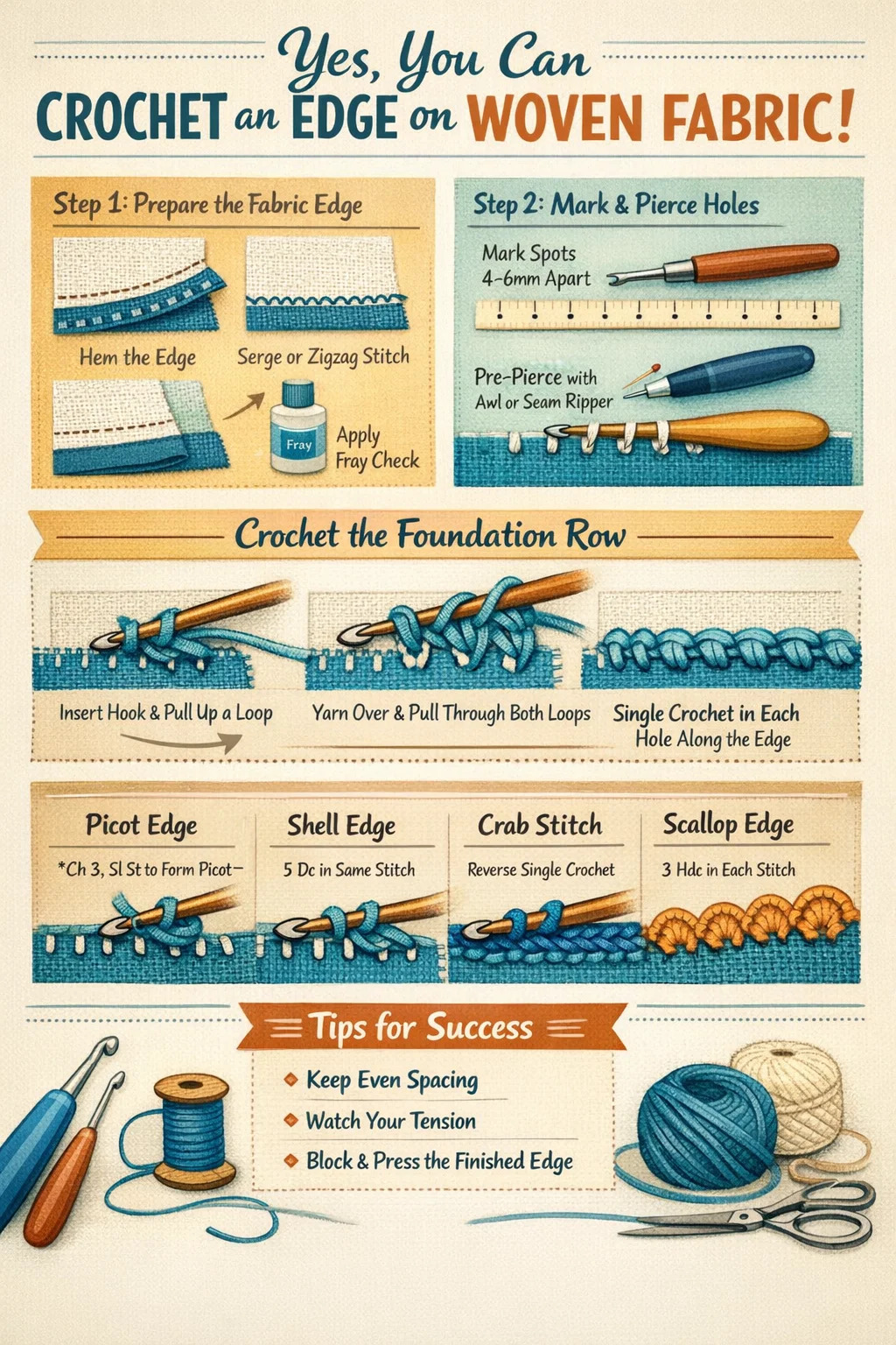 Không giống như vải dệt kim, vải dệt thoi không có các vòng tự nhiên để bạn nhét móc vào. Thay vào đó, bạn xuyên qua vải hoặc xuyên qua các lỗ được tạo sẵn, đó là lý do tại sao kỹ thuật và sự chuẩn bị tạo nên sự khác biệt. Khi bạn hiểu được cơ chế, việc thêm mép móc vào vải dệt thoi - cho dù đó là vải bông, vải lanh, denim hay bất kỳ loại vải dệt thoi nào khác - sẽ trở thành một kỹ năng có thể lặp lại và thỏa mãn.