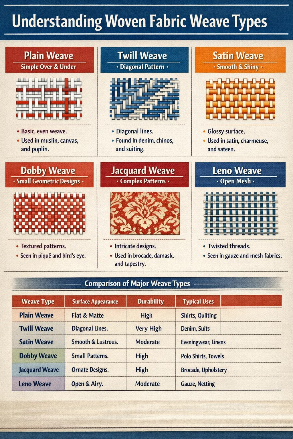 Bảng dưới đây tóm tắt các đặc tính chính và cách sử dụng phổ biến của từng loại dệt chính để giúp so sánh trực tiếp dễ dàng hơn.