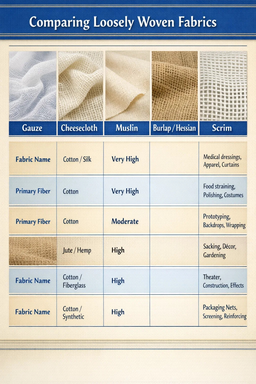 Không có loại vải dệt lỏng lẻo nào có chất lượng vượt trội trên toàn cầu. Mỗi tên trong danh mục này đại diện cho một loại vải được thiết kế - một cách có ý thức hoặc qua nhiều thế kỷ phát triển thủ công - để vượt trội trong lĩnh vực cụ thể của nó. Biết từ vựng đầy đủ về các loại vải dệt hở và dệt thưa, từ gạc đến vải leno, cho phép bạn đưa ra lựa chọn dựa trên chức năng chứ không phải phỏng đoán.