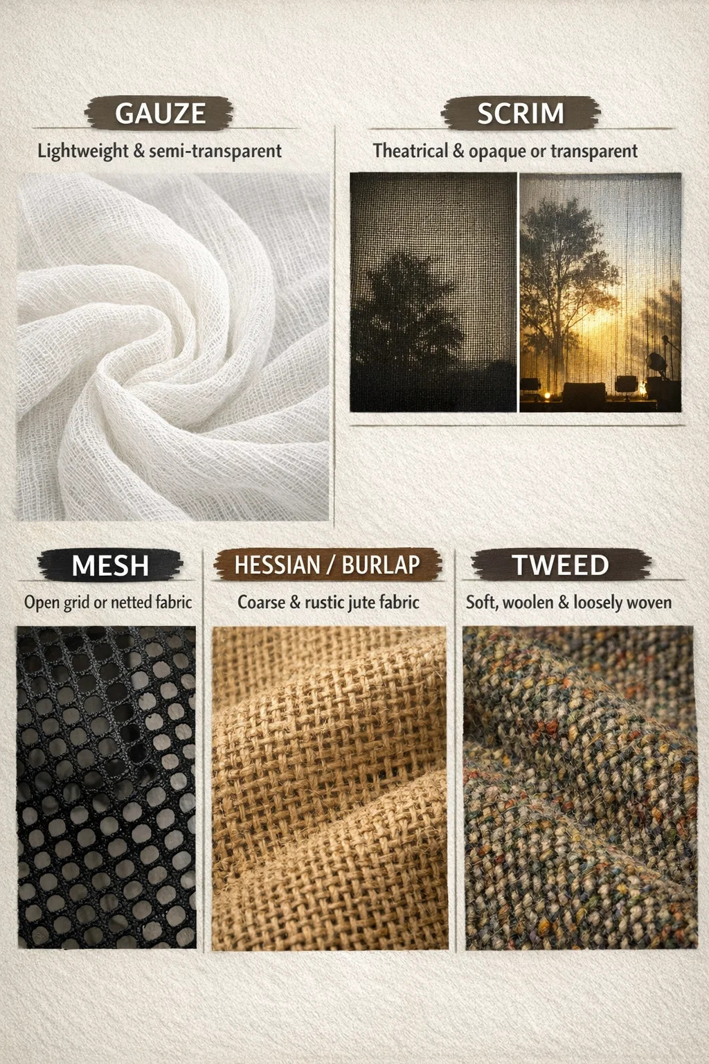 Khi nói về vải dệt với "kết cấu lỏng lẻo và khoảng trống lớn", có một số thuật ngữ rất cụ thể để mô tả chúng, tùy thuộc vào cách sử dụng và hình thức của chúng.