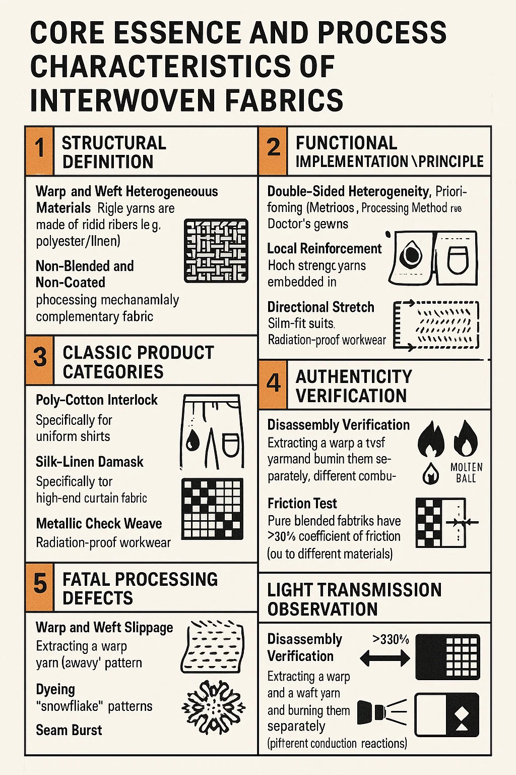 Xác minh khi tháo rời: Tách sợi dọc và sợi ngang rồi đốt chúng riêng biệt—vải dệt đan xen đích thực sẽ thể hiện các phản ứng cháy khác nhau (ví dụ: tro sợi ngang sợi bông/quả bóng nóng chảy sợi dọc polyester).