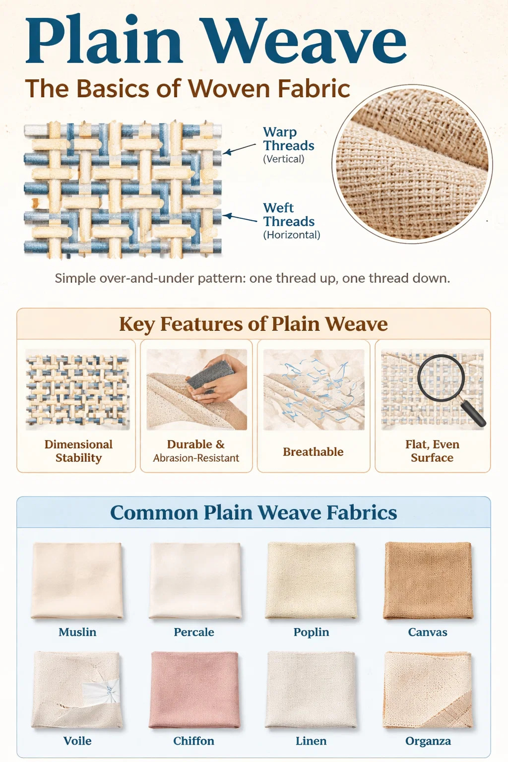 Cơ bản nhất vải dệt là vải dệt trơn —một loại vải được tạo ra bằng cách đan xen các sợi dọc (chạy theo chiều dọc) và sợi ngang (chạy ngang) theo kiểu trên và dưới xen kẽ đơn giản. Mỗi sợi ngang đi qua một sợi dọc, rồi đi dưới sợi tiếp theo, trên toàn bộ chiều rộng của vải. Hàng tiếp theo đảo ngược trình tự này. Điều này tạo ra cấu trúc dệt chặt chẽ nhất, đồng đều nhất và ổn định nhất và là điểm khởi đầu để hiểu cách cấu tạo của tất cả các loại vải dệt thoi.