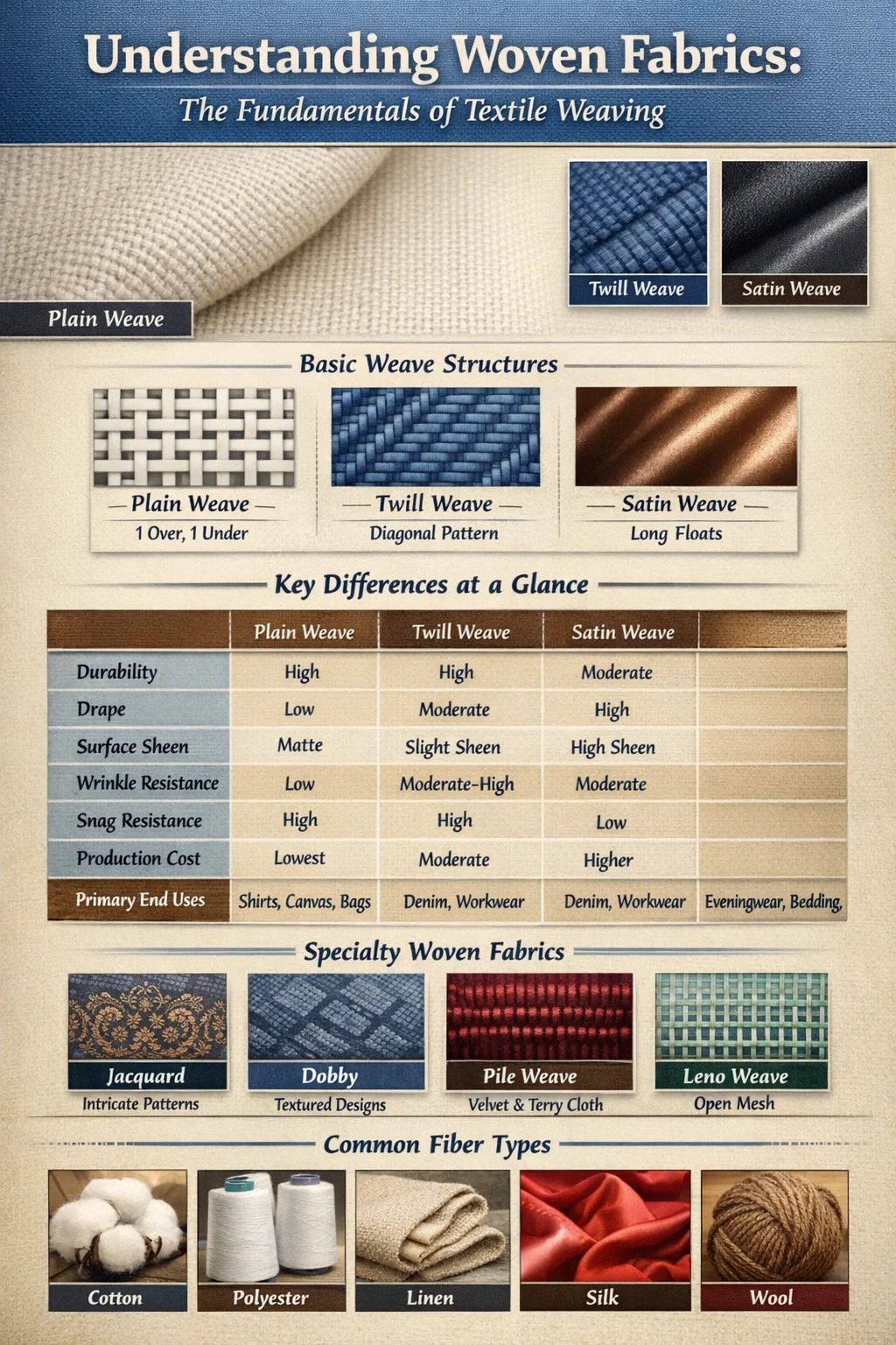 Có ba kiểu dệt chính tạo nên nền tảng của gần như tất cả các loại vải dệt thoi: dệt trơn, dệt chéo và dệt sa tanh. Mọi cấu trúc dệt khác - từ canvas, nhung đến jacquard - đều bắt nguồn từ hoặc được xây dựng dựa trên ba loại cơ bản này.