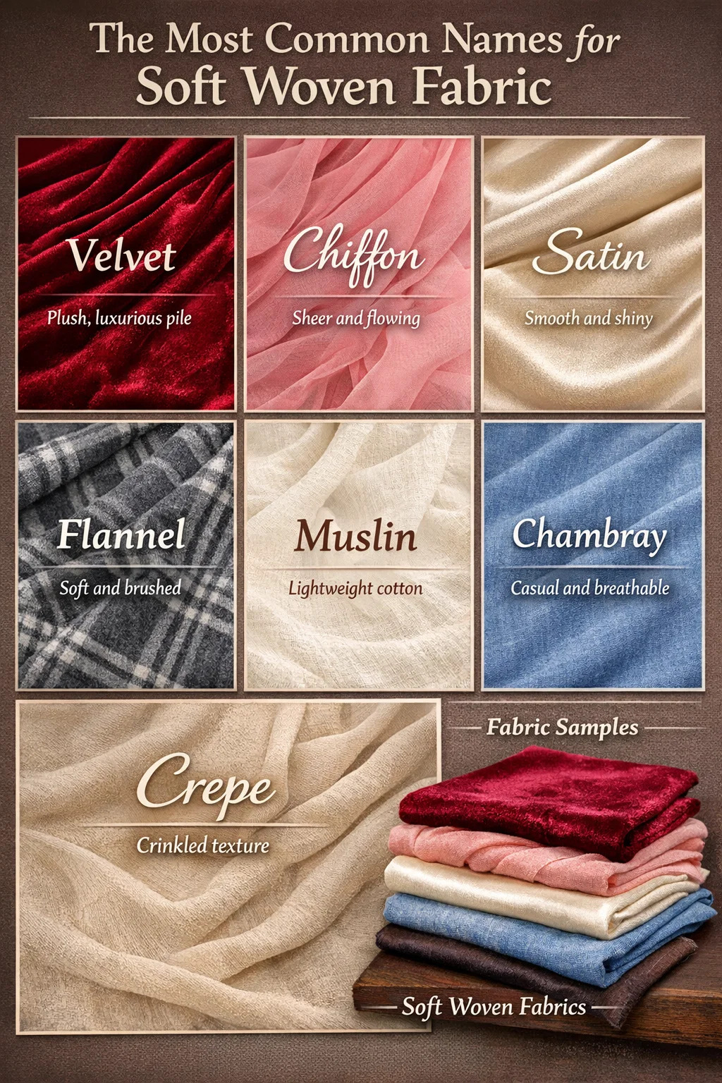 Khi mọi người hỏi "tên của loại vải dệt mềm là gì", câu trả lời phụ thuộc vào hàm lượng sợi, cấu trúc dệt và độ hoàn thiện. Các loại vải dệt mềm được công nhận rộng rãi nhất bao gồm nhung, voan, sa-tanh, vải muslin, vải flannel, chambray và crepe . Mỗi loại sợi này được sản xuất trên khung dệt sử dụng các sợi đan xen, tuy nhiên chúng có cảm giác hoàn toàn khác nhau do cách sắp xếp, xoắn hoặc hoàn thiện các sợi sau khi dệt.