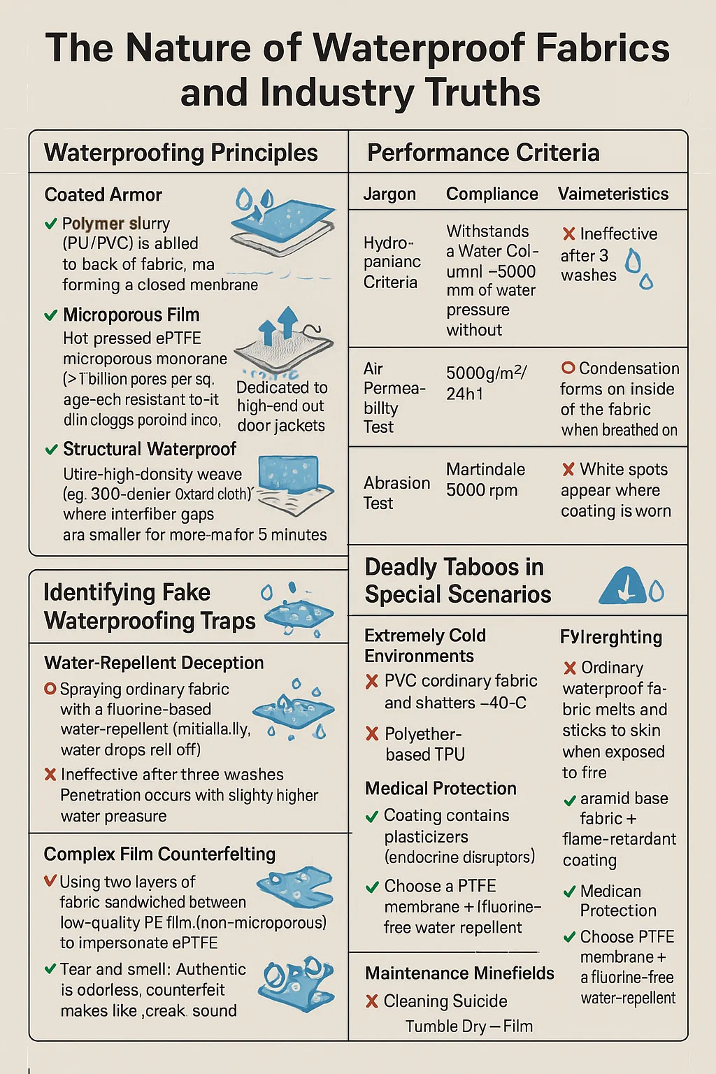 Cấu trúc không thấm nước: Dệt có mật độ cực cao (ví dụ: vải Oxford 300 denier), trong đó các khoảng trống giữa các sợi nhỏ hơn áp suất của các phân tử nước. ** Bền bỉ ** Không chịu được mưa bão quá 5 phút.